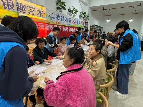 志愿者精心策划并组织了形式多样、内容丰富的互动活动,现场气氛温馨而融洽。在“巧手生花”手工坊中,志愿者们耐心讲解制作步骤,一对一协助老人缝制香囊、绘制环保塑料袋画。大家边做边交流,老人们神情专注、笑语不断,在动手实践中感受创作的乐趣。随后的有奖问答环节将现场气氛推向高潮,内容涵盖传统文化、健康知识等,老人们踊跃参与,掌声与欢笑声此起彼伏,展现出积极乐观的精神风貌。