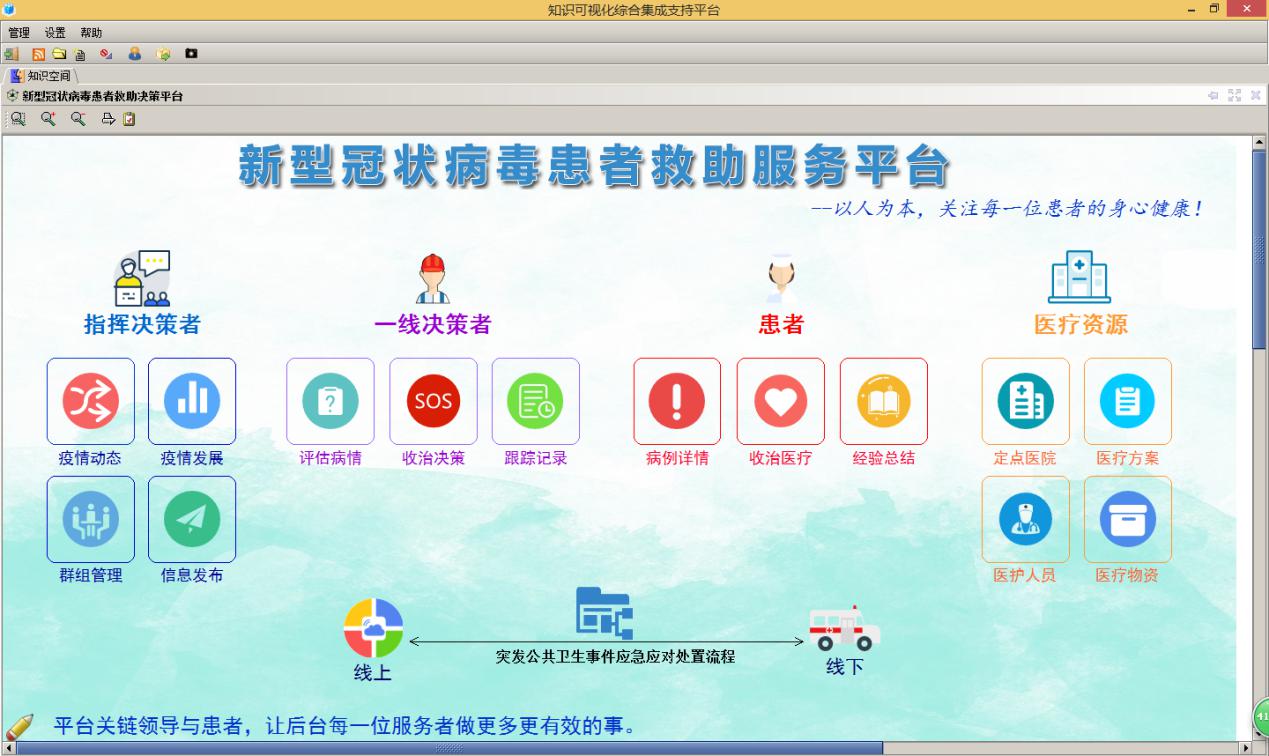服务平台由三大块五个方面组成。第一大块是患者过程化救助服务(应急应对)、第二大块是患者救助服务网站、第三大块是患者跟踪管理地图服务。五个方面是三大块的融合,包括:患者救助过程化服务平台、针对具体突发事件的应急服务、患者救助服务网站、患者跟踪管理地图服务以及疫情动态分析。患者救助过程化服务平台是围绕患者救助的决策服务,从实时线索获取事件,对速报的线索进入分析确认,针对具体突发事件开展相应应急应对服务;患者救助服务网站为患者提供救助、身心健康咨询以及上报突发应急事件线索;对患者的救助可采用患者跟踪地图(三维数字地图)了解相关情况;疫情动态分析主要以统计图形和三维GIS方式对当前最新疫情进行分析,为决策提供参考。