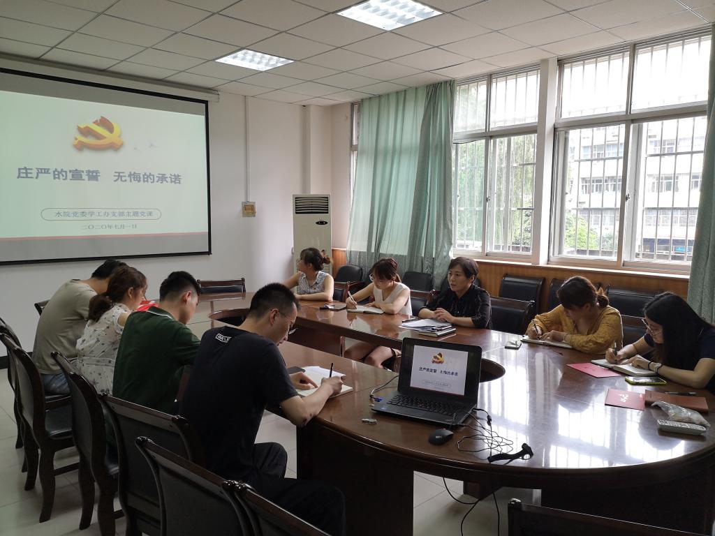 7月1日下午,必赢网络游戏平台学工办党支部在教四楼207会议室开展了题为“庄严的宣誓、无悔的承诺”的主题党课学习。党课由院党委副书记、副院长李红英主讲,支部全体党员参加学习。