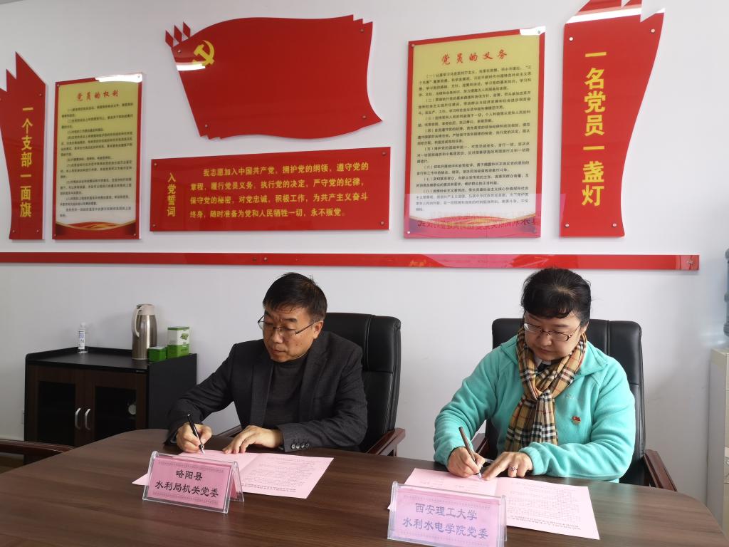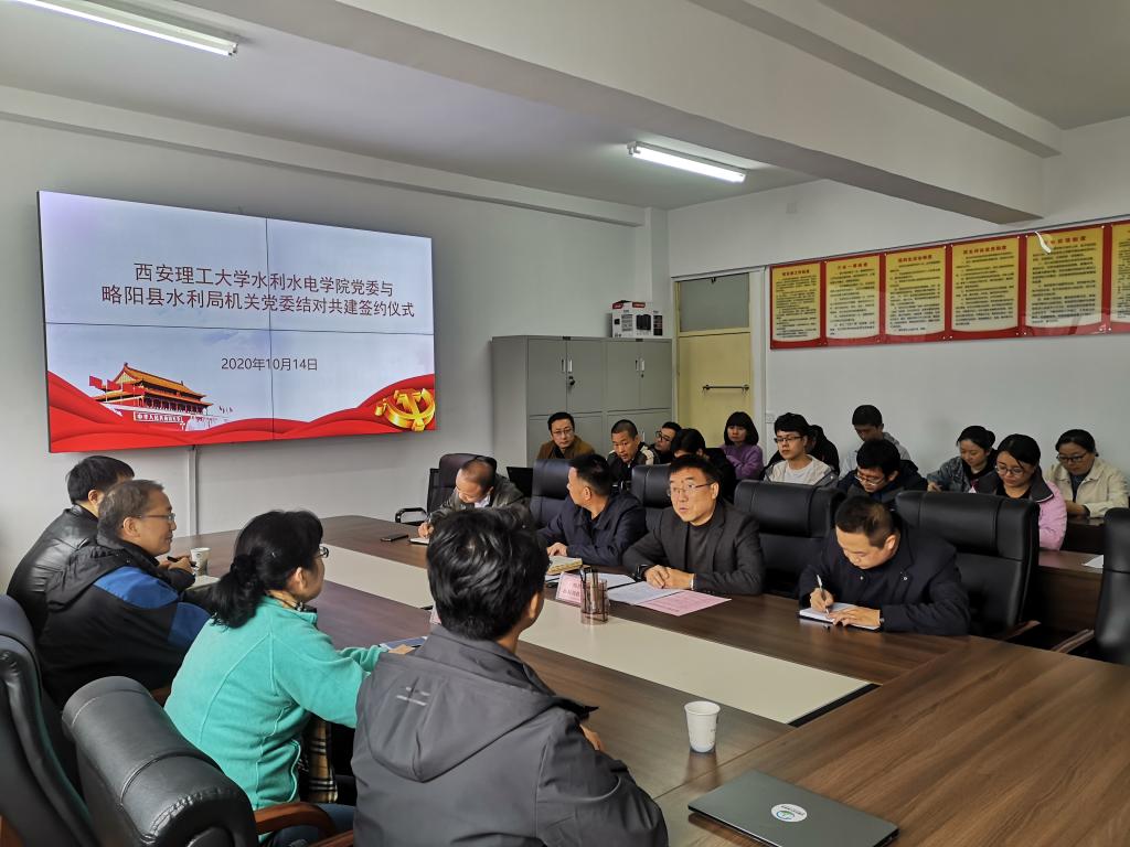 为进一步丰富校地合作载体,深化科技扶贫成效,巩固脱贫攻坚成果,全面打赢脱贫攻坚战,10月14日,在第28个“国际减贫日”和第7个“国家扶贫日”到来之际,学院党委书记程文带队赴略阳县水利局开展结对共建及水利技术专题报告。略阳县水利局局长、党组书记张建国,副局长宋天平、李维刚,党组成员王志文出席签约仪式,学院教授郑兴、侯精明,高级工程师雒亿平,副教授王雯,各支部教师代表及水利局骨干成员共同参加了活动。
