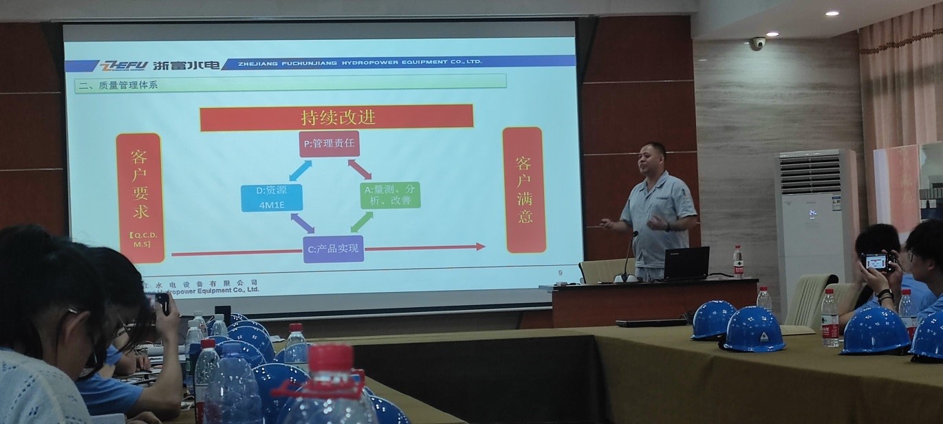 在浙富水电,首先由我校校友郑怀勇总经理、章焕能副总经理为实习学生分析了双碳背景下国际国内水电及新能源的发展机遇和挑战,讲述了浙富水电从一个很不起眼的配件厂成长为具有较强研发能力的、我国目前规模最大的民营水电机组专业制造商的发展历程,勉励同学们认真学习专业知识,为我国水电及新能源的发展贡献西理工力量。