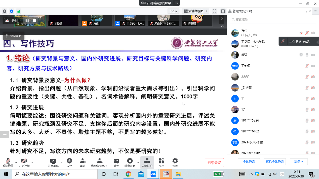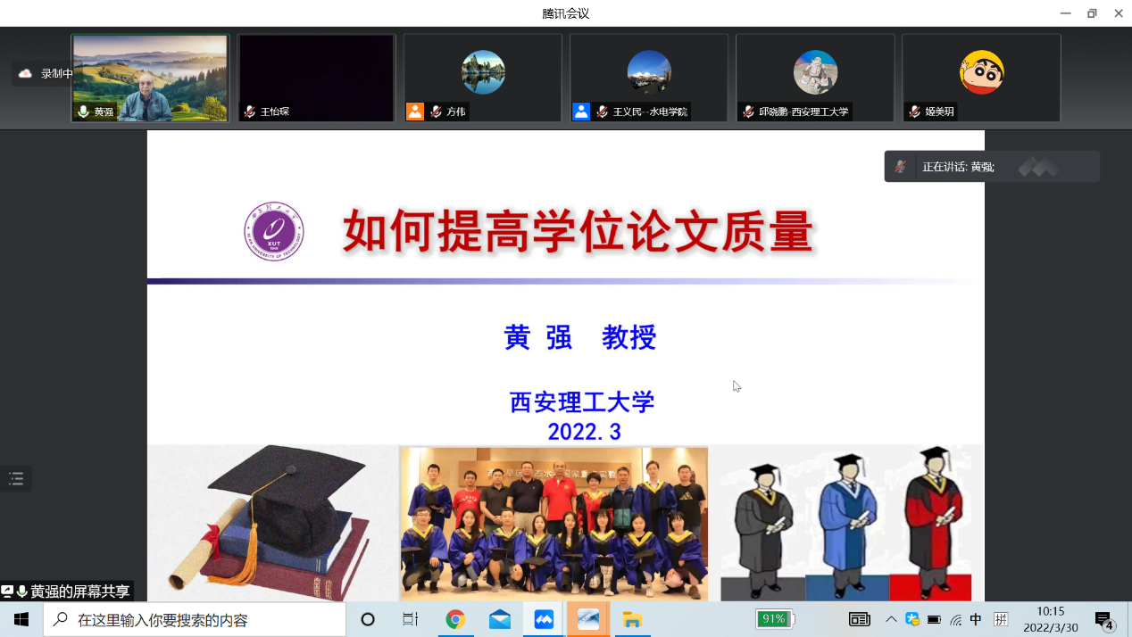 2022年是我校研究生学位论文质量提升年,学院高度重视,并规划了系列学术活动。2022年3月30日上午,学院特邀请了国家万人计划教学名师黄强教授作题为《如何提高学位论文质量》的专题讲座(线上形式)。讲座由必赢网络游戏平台副院长王义民教授主持,学院部分中青年教师、博硕士研究生共500余人参加。
