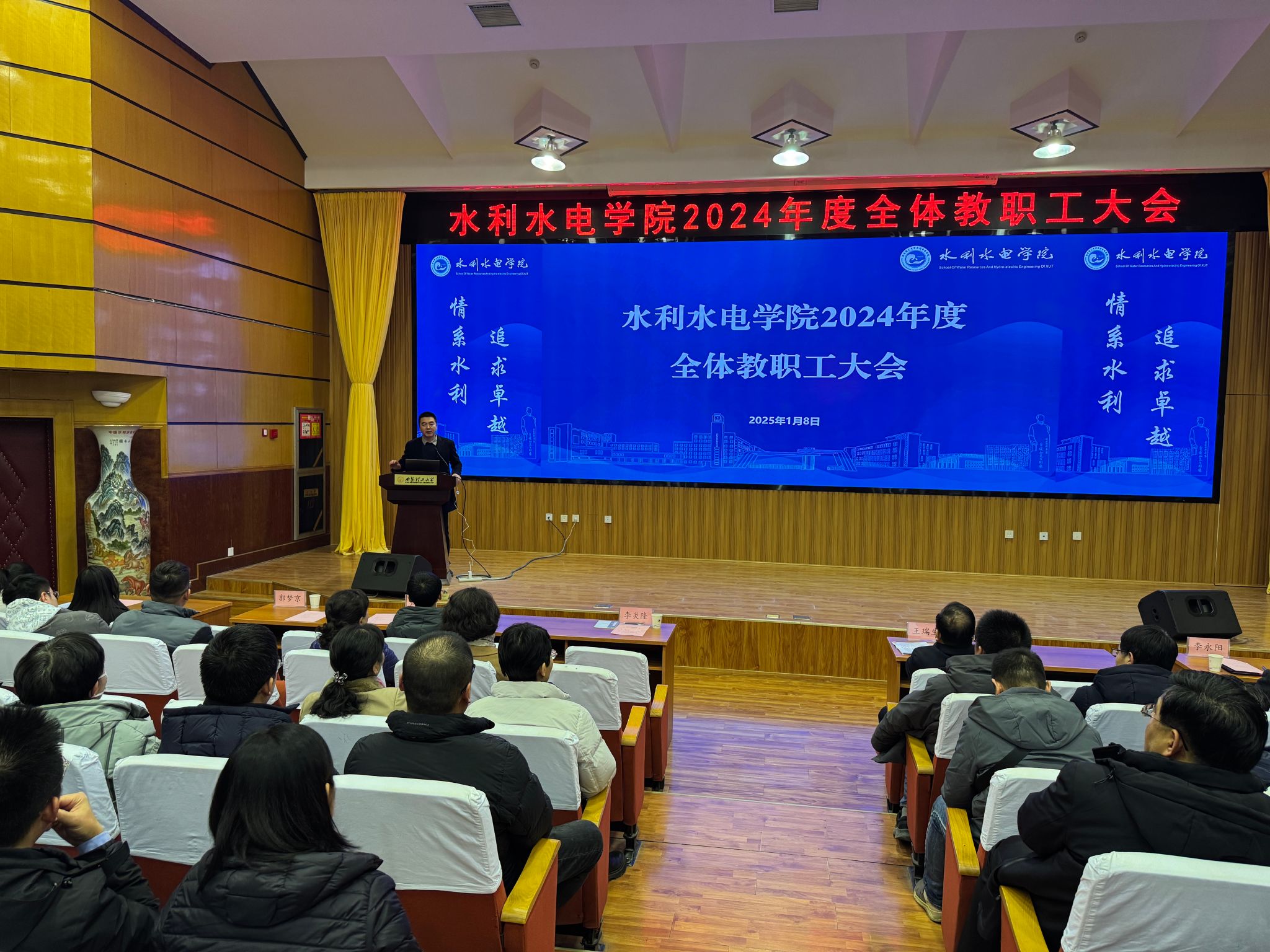 王瑞生代表学院领导班子向全体教职工表示衷心的感谢。他客观分析了2024年取得的成绩以及工作中存在的不足。他强调,2025 年是学校“双一流”建设的关键时期,全体教职工要抢抓机遇、迎难而上,聚焦“双一流”建设总目标,坚持问题导向,狠抓任务落实。要持续深化“一个理念、四项工程、五个平台”建设,充分发挥基层党组织和党员的示范引领作用,抓好特色培育,讲好专业故事。要紧密围绕高层次人才、重大科研项目等关键指标,团结一心,迎难而上,集中发力,挂图作战,确保各项重点工作落实落细落地。要切实改变工作作风,围绕学院中心工作,秉持一颗公心,工作中相互支持、相互包容、相互配合,形成合力,努力推进学院高质量发展。