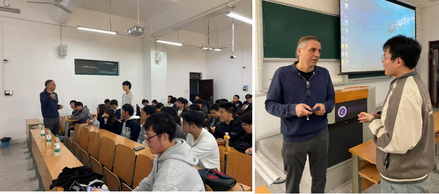 互动交流环节中,现场师生就海外深造选择、跨学科背景构建、课程衔接与科研方向等问题踊跃提问。Potito 教授逐一回应,提出“尽早规划、突出优势、重视综合能力与社会责任”的备考与求职思路。
